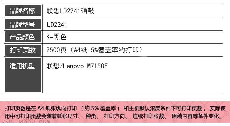 • 商品名称:联想(Lenovo) LD2241硒鼓 适用联想 M7150F/颜色:黑色/