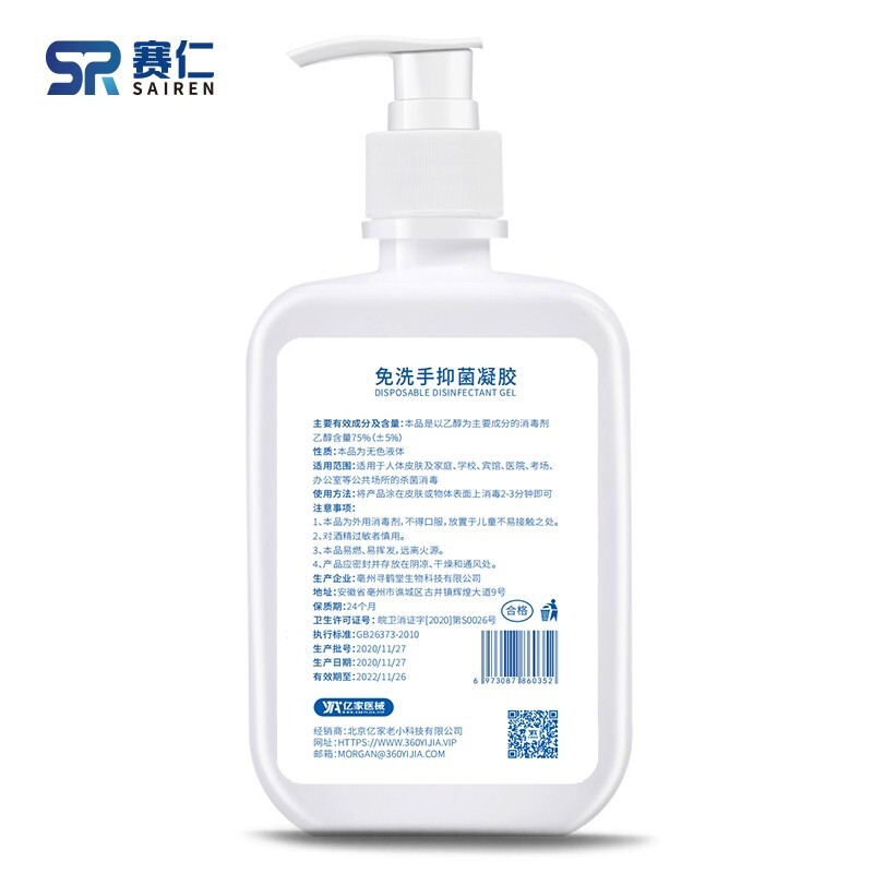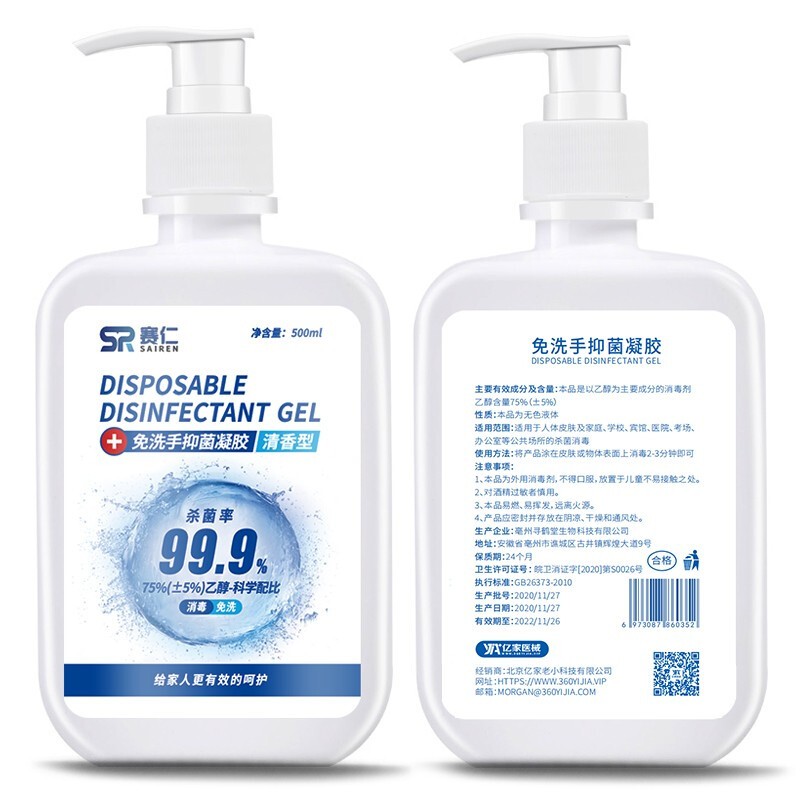 • 商品名称:赛仁 免洗消毒凝胶洗手液 含75%医用酒精 500ml/瓶装 欧盟CE 美国FDA双认证