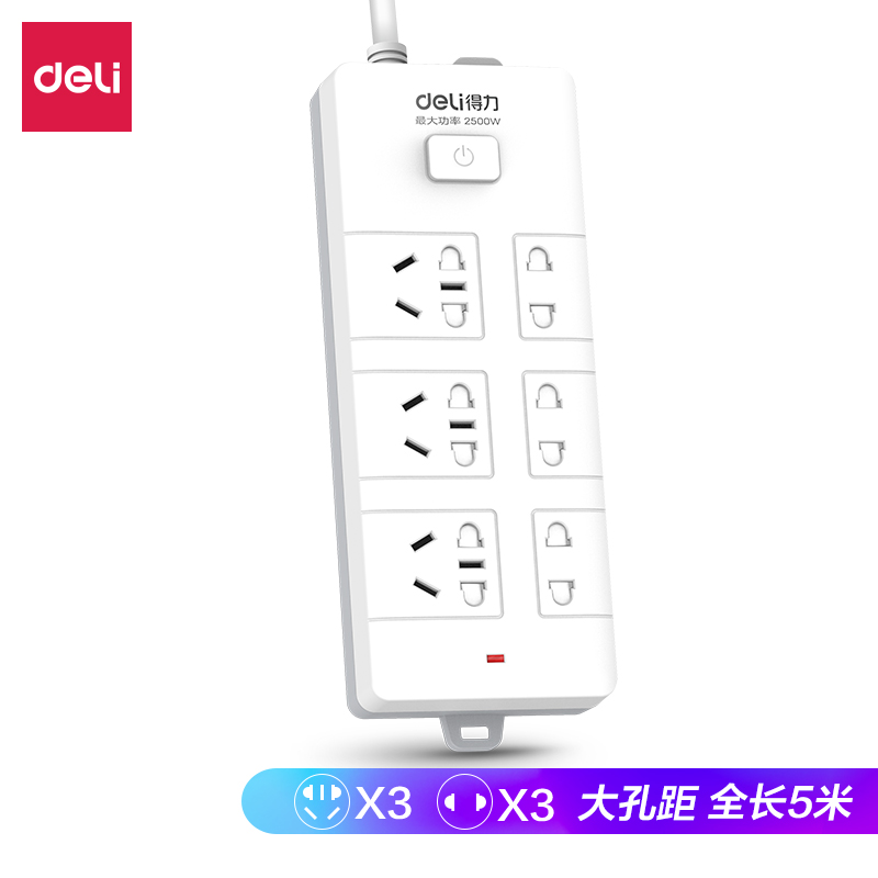• 商品名称:得力18257插座_3+3_5米_PVC袋装(白)(只)